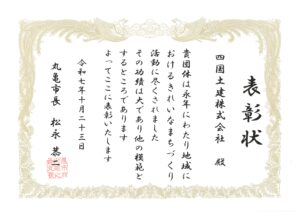 丸亀市長より地域におけるきれいなまちづくり活動の功績として表彰をいただきました。